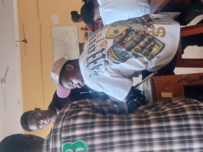 The scene depicts an indoor classroom or lecture hall in Ukukwa, Nigeria, featuring light yellow walls, wooden desks, and red-brown wooden stools. Two ceiling fans are mounted overhead, and a white board with faint markings is visible on the rear wall. In the foreground, an individual stands with their back to the camera, wearing a brown and white plaid shirt with a green letter 'B' on the upper back. To the left of center, a male with glasses and a dark shirt looks directly towards the viewer. Seated at a wooden desk in the midground, a male wears a light pink and tan cap along with a white t-shirt. The t-shirt's back features a detailed graphic of two dark-skinned hands adorned with multiple gold-colored rings, holding large dollar bills and displaying a dollar sign pendant. This individual is turned to his left. In the background, other individuals are partially visible, seated at desks, including one with dark hair pulled back and another wearing a white shirt.