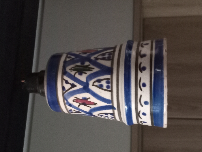 - "A ceramic bell-shaped lamp shade, primarily white with intricate dark blue patterns, is suspended indoors in Meknes, Morocco" by FM-63a4R2, licensed under CC BY 4.0