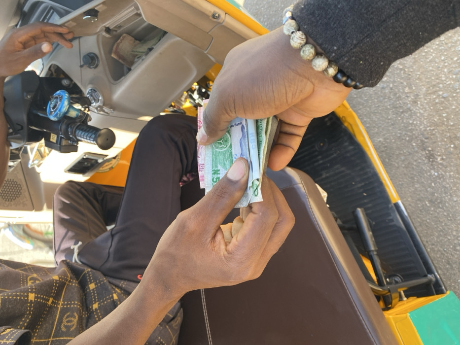 The image depicts a monetary transaction occurring in the city of Rukuba Road, Nigeria