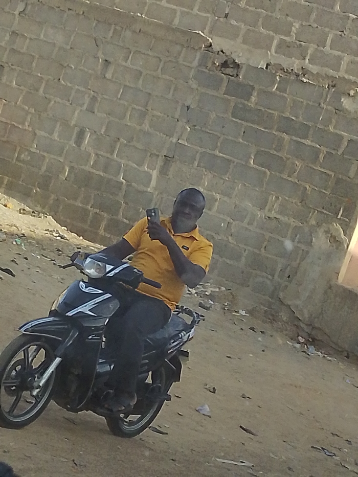 A man in a yellow shirt sits on a black motorbike in front of a cinder block wall. He holds a mobile phone up, possibly taking a photo or recording a video. Debris litters the ground next to the wall. The man faces the camera with a smile. The area appears to be a dirt or sand lot.