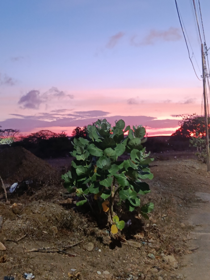 The image depicts an unpopulated outdoor scene at dusk in Altagracia, Venezuela. The sky transitions from light blue at the top, through shades of purple, to a vivid band of pink and orange along the horizon, with scattered, diffuse clouds present. In the foreground, the ground consists of uneven, reddish-brown soil mixed with dry vegetation and scattered debris, with a narrow, unpaved edge visible on the right. A prominent, leafy green bush, approximately one meter tall, with some yellowish leaves near its base, is centered in the midground. To the left of the bush, a dark mound of earth or debris is visible. Along the right edge, a utility pole with multiple dark wires extends upwards. A line of silhouetted trees and vegetation is visible along the distant horizon against the illuminated sky. No people, animals, or active interactions are observed.