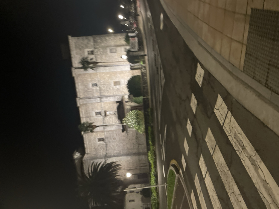 An old stone building is on the left side of the image, illuminated at night. Palm trees grow in front of it. The right side of the image shows a street with crosswalks. The street is empty, and the lighting is dim. A sidewalk runs along the edge of the street. The perspective is slightly tilted, giving a distorted view of the scene. The overall mood is quiet and urban.