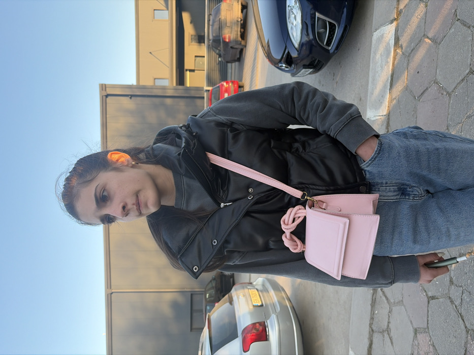 A young female stands outdoors in Cherven Bryag, Bulgaria, under a clear, light blue sky with low, warm sunlight suggesting early morning or late afternoon
