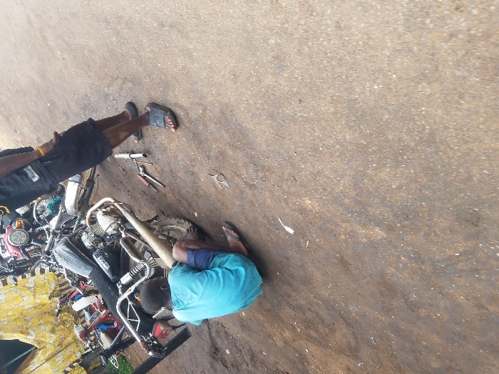 The image displays an outdoor scene in the city of Unknown, Unknown, depicting a motorcycle repair operation