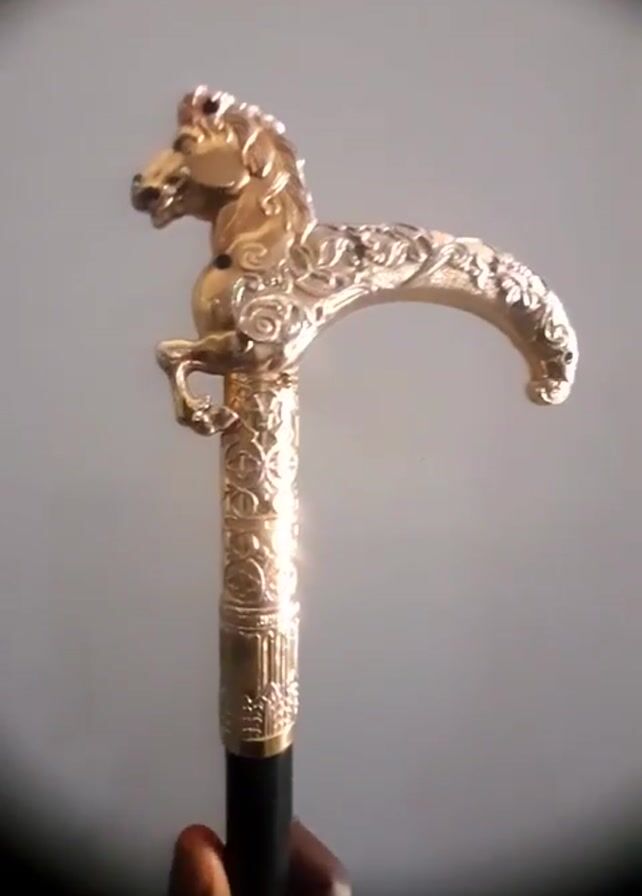 gold-colored horse-headed walking cane being held by a person’s hand. The cane’s handle is shaped like a rearing horse and is highly decorated with floral and other design elements. The cane itself is black. The background is a plain light gray wall. The camera seems to be looking through a small circular lens.
