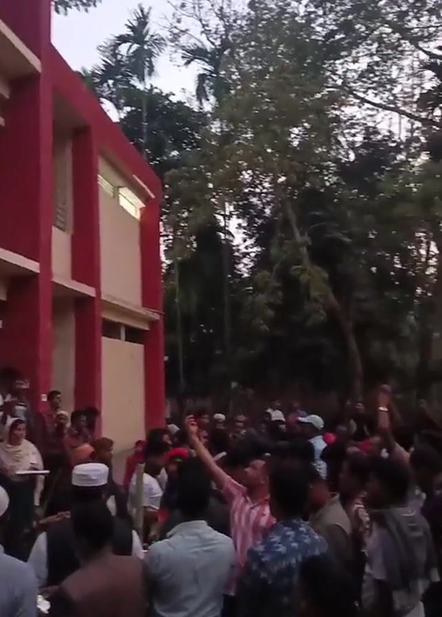 A large group of people are gathered in what appears to be an outdoor area near a building. The building is two stories high and has a red and beige exterior. Some people are on the balcony of the building, addressing the crowd below. The majority of the crowd is standing on the ground, facing the building. Many are wearing white caps, suggesting a religious or cultural gathering. There are trees in the background, and the sky suggests it is either early morning or late afternoon. The crowd appears to be engaged and perhaps chanting or listening attentively to the speakers. There is movement and general hubbub within the group.