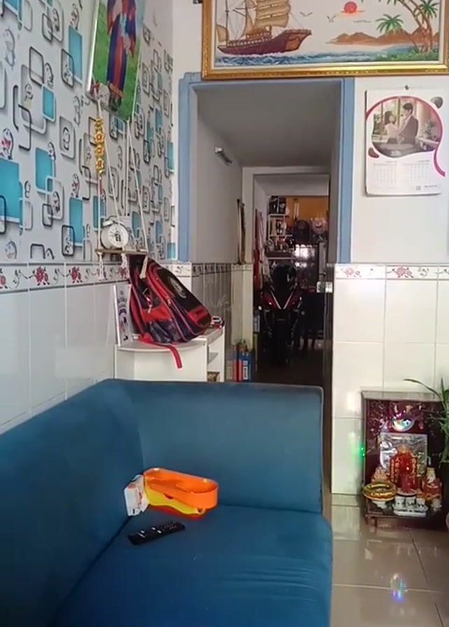 Certainly! Here is a brief, forensic description of the scene: The video shows a room in what appears to be a private home. The camera is positioned in a manner that makes the scene seem rotated or flipped. The decor includes a framed artwork of a sailing ship on the left wall, a calendar, and various decorative items. The tiled floor is patterned. A blue sofa is visible on the right, with an orange object and a remote control on it. Through a hallway or doorway, there are glimpses of another room with a motorcycle or scooter. A child walks into the space through the hallway. Backpacks and other miscellaneous objects are scattered around the immediate area.