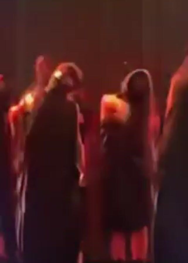 group of silhouetted people on a stage bathed in red and orange light. They appear to be performing some kind of coordinated movement or dance, raising their arms in unison. The scene is blurry, making it difficult to distinguish specific features.