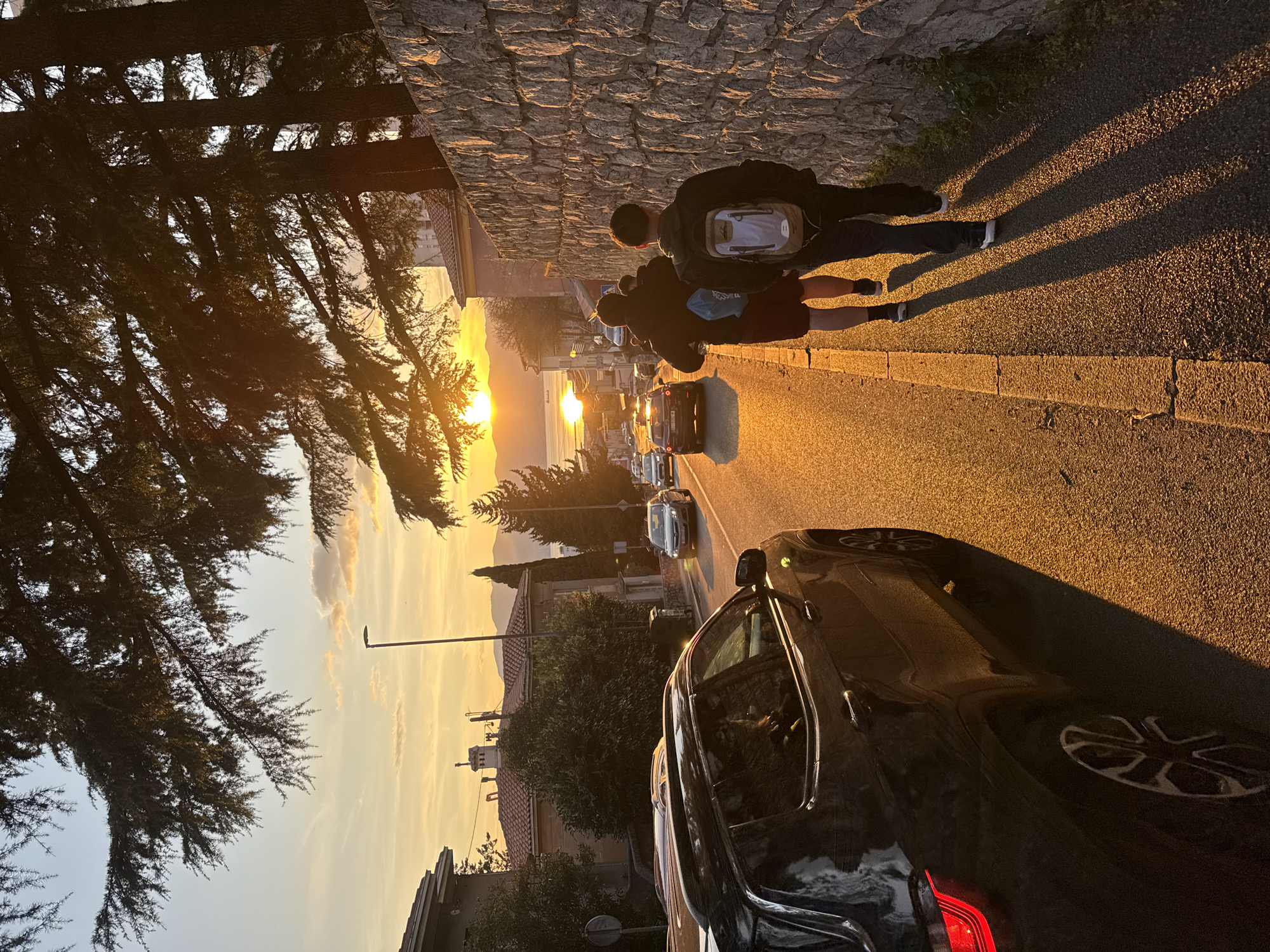 The image depicts a sunset view of Grad Rijeka, Croatia, along a street with parked cars and moving traffic. Two pedestrians walk along the sidewalk adjacent to a stone wall. The sun is setting over the water in the distance, casting long shadows. Buildings and vegetation line the street. A black car is parked on the right side of the frame, partially obscuring the view.