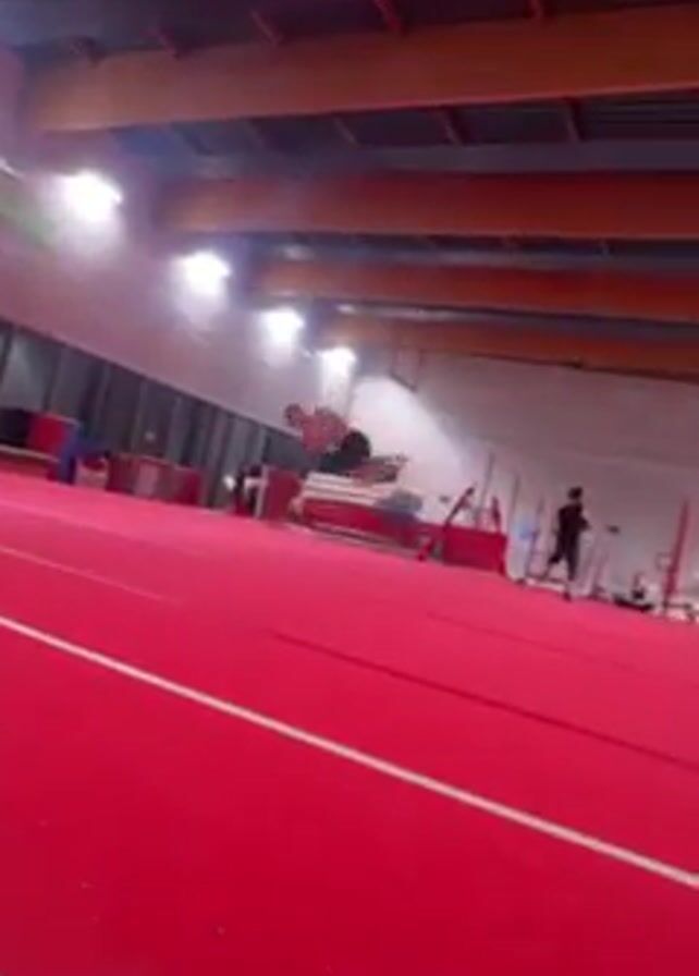 person performing gymnastics on a red mat. The person is wearing shorts and appears to be barefoot. They are moving across the mat with dynamic movements, possibly a series of tumbling or acrobatic skills. The setting is a large gymnasium or training facility with high ceilings, visible beams, and overhead lighting. Other individuals are present in the background, likely other athletes or trainers. Gymnastic equipment is seen along the sides of the mat.