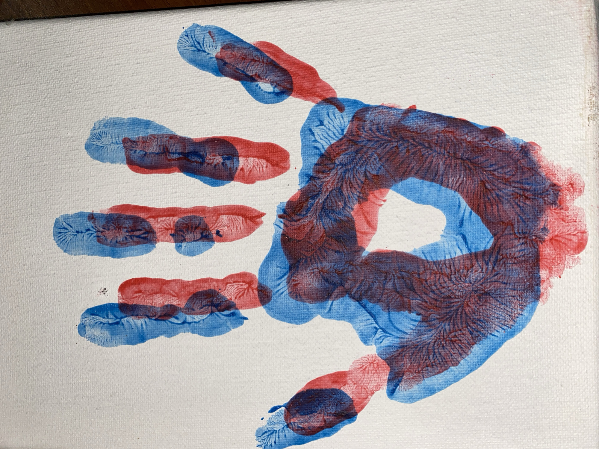 A close-up image of a canvas with two overlapping handprints in red and blue ink