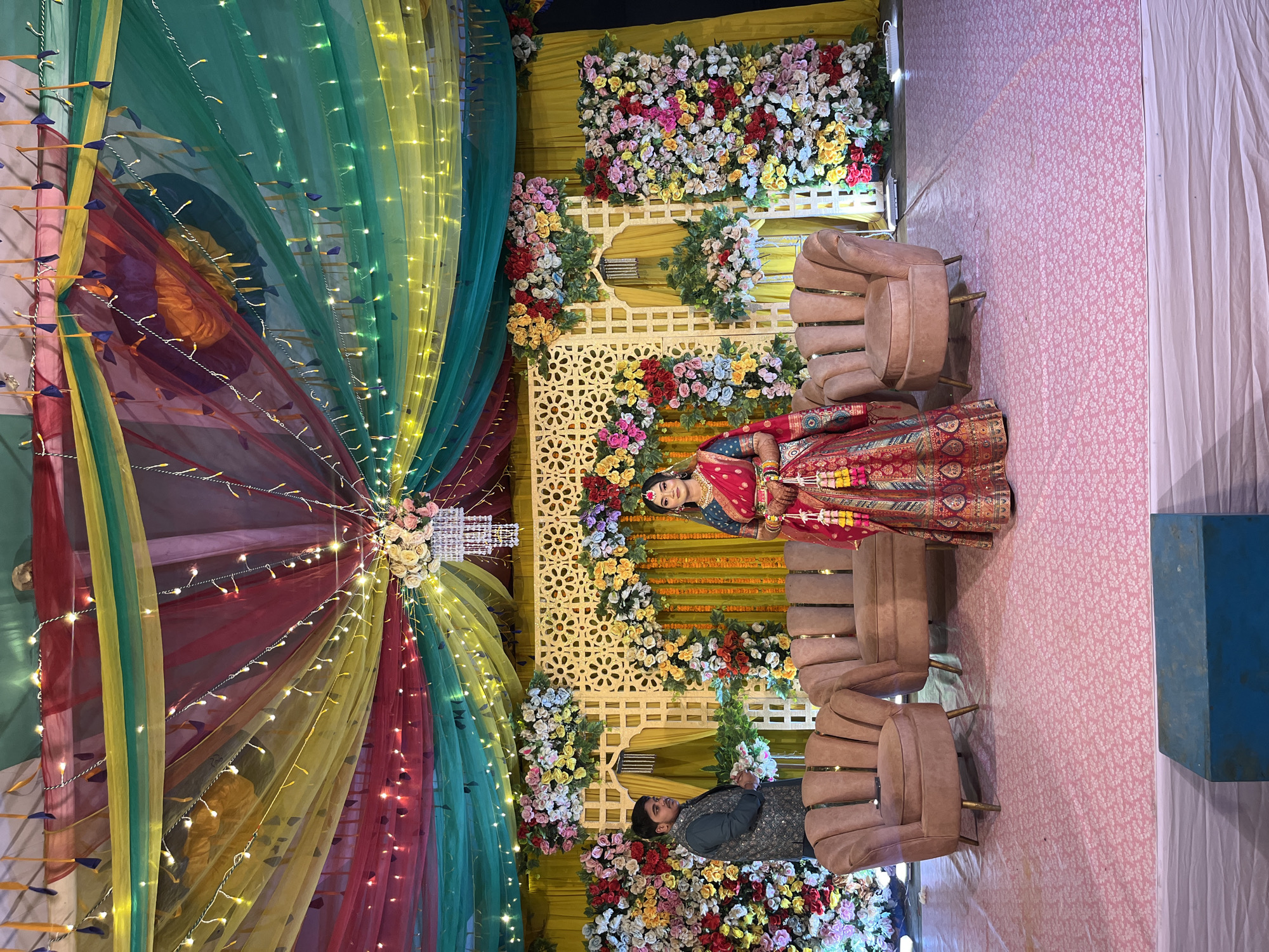 The image displays an elaborately decorated indoor event venue, located in Savar, Bangladesh. A stage is set with a backdrop of yellow curtains overlaid with ornate white lattice panels, heavily adorned with multi-colored artificial floral arrangements in hues of red, pink, yellow, white, blue, and green. The ceiling is draped with translucent fabrics in red, yellow, green, and teal, illuminated by numerous strands of fairy lights and a central chandelier decorated with white and pink flowers. Two individuals are present on the stage. A female subject stands centrally, facing the viewer, dressed in a red lehenga with gold embroidery, a teal blouse, and a red dupatta. She wears extensive traditional jewelry, including a maang tikka, necklace, earrings, and bangles, and holds colorful floral garlands in her clasped hands. To her left, slightly behind her, a male subject stands facing right, wearing a dark textured jacket over a dark shirt, with his hands clasped in front. Three pieces of light brown or blush pink upholstered furniture, comprising two armchairs and one sofa with ribbed backs and brass-colored legs, are arranged on the stage. The floor is covered with a light pink carpet featuring a subtle white floral pattern. A rectangular blue block rests on the carpet in the foreground.