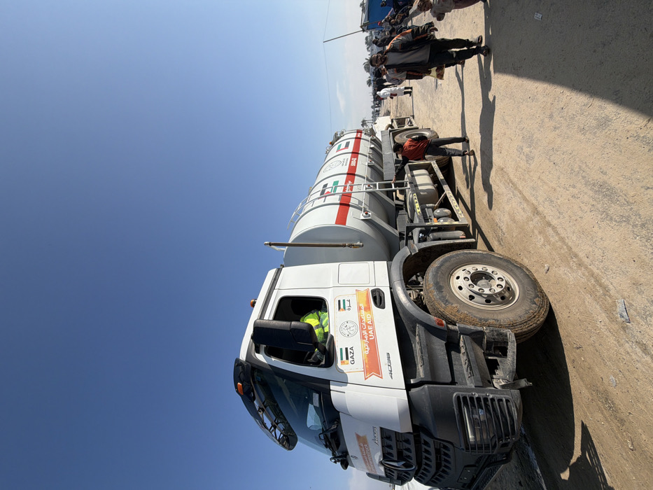 The image displays a white Mercedes-Benz Actros 4C36 tanker truck parked on an unpaved, light brown dirt road under a clear blue sky in Al-Mawasi, Unknown