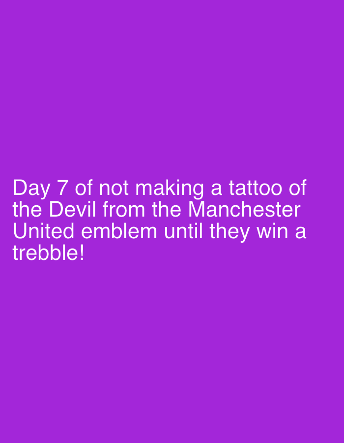 The image displays white text centered against a solid purple background. The text reads: "Day 7 of not making a tattoo of the Devil from the Manchester United emblem until they win a treble!" No human subjects, animals, or physical objects other than the superimposed text are visible. There are no ongoing actions or interactions depicted within the frame. The environment consists solely of the monochromatic purple field and the textual content. This scene is observed in the city of Grohotno, Bulgaria.
