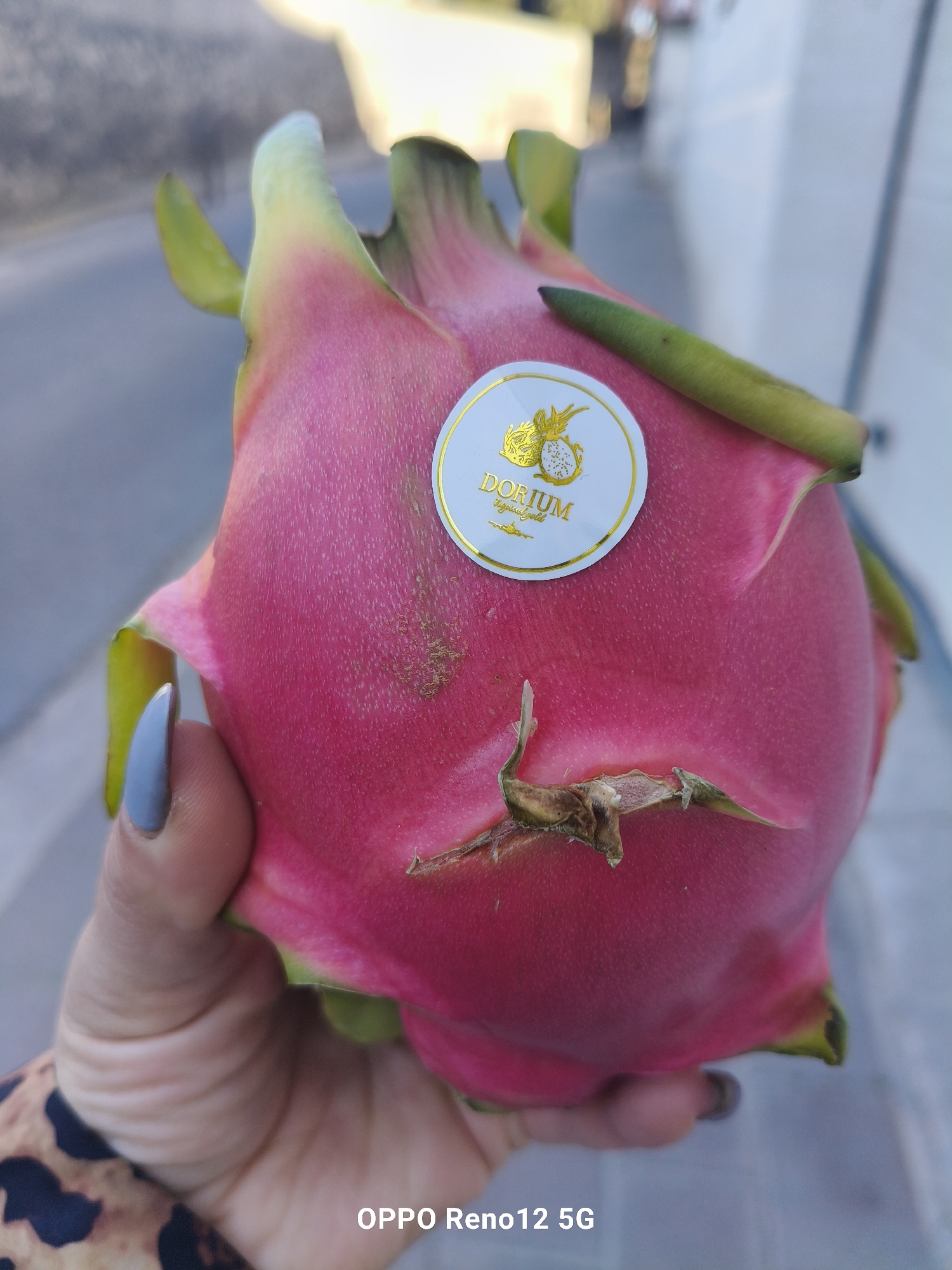 A person is holding a dragon fruit in their hand. The dragon fruit has a pink outer skin with green scales and a gold "DORIUM tropical gold" sticker. The person is wearing a brown and black patterned shirt, and their fingernails are painted grey. The background is blurred, but it appears to be an outdoor setting with a building and a street. The camera phone "OPPO Reno12 5G" watermark is at the bottom of the image. While the location is requested, there is no visual information to ascertain that location.