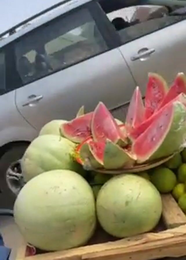 street vendor in a sunny, rural area pushing a wooden cart laden with produce. The cart features whole watermelons, sliced watermelons wrapped in plastic, and small green citrus fruits, possibly limes. A man in a light blue robe pushes the cart on a dirt road past buildings. In the background, other people walk by. Several yellow and blue three-wheeled vehicles can be seen parked in the distance.