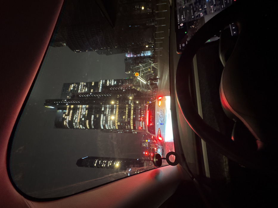 A nighttime view from inside a car, looking through the windshield. Illuminated skyscrapers are reflected in the glass, with a car directly ahead, its taillights glowing red. To the right, a steering wheel is visible, and a screen is mounted on the dashboard. The scene suggests the car is in city traffic.