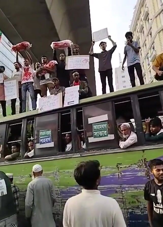 street scene with a crowd of people around a green and purple bus. Some people are inside the bus looking out the windows, while others are on the roof of the bus holding signs and what appears to be raw meat. Some people on the roof are raising their arms and chanting. In the background, there are tall buildings and an elevated highway.