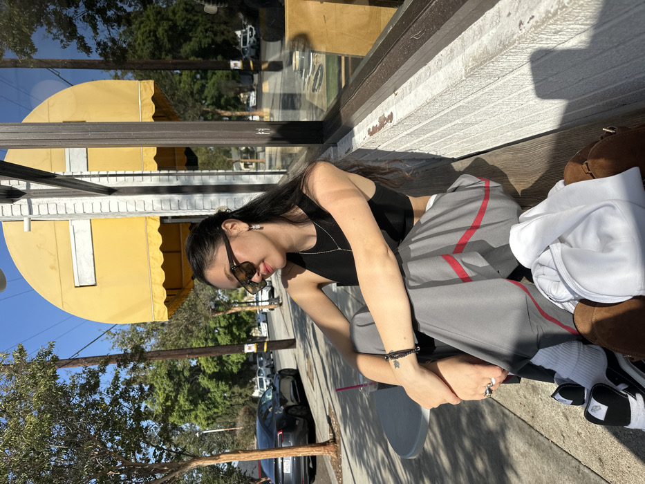 - "A young female with dark hair and sunglasses is seated outdoors on a concrete ledge next to a building with a large window and a yellow retractable awning" by FM-lh4BM2, licensed under CC BY 4.0