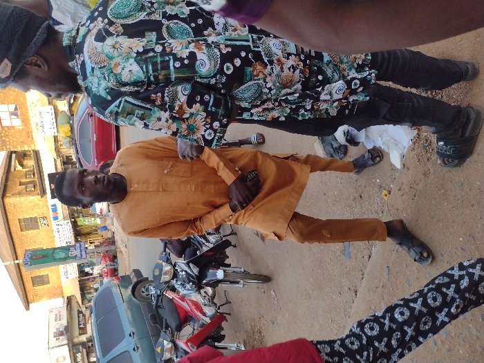 This image captures an urban street scene in Jos, Nigeria, during daylight hours. In the foreground, two adult males are prominently featured. On the left, a man with short dark hair and a beard wears a long-sleeved, collared, orange-brown traditional tunic (kaftan) and matching trousers, paired with dark leather sandals. He stands with his hands clasped in front, looking towards his right. To his right, partially seen from the back and side, is another adult male wearing a black beanie, a black shirt with intricate green, white, and floral patterns, dark trousers, and dark slide sandals. He appears to be facing the man in the orange-brown attire. A third individual's lower leg and torso are partially visible on the far left, wearing black leggings with white "XOXO" patterns and a red garment. The ground in the immediate foreground is uneven and unpaved, consisting of reddish-brown dirt, with scattered white plastic debris. Behind the subjects, several motorcycles are parked along what appears to be a curb, including a red and black model and a black model. Further back, a dark teal minivan is parked. The background features a bustling street with several multi-story buildings housing shops, indicated by various signs. A prominent green "Opay" sign on a pole is visible in the mid-ground. Other signs, including one that reads "A-Z FEMS," are also present. Vehicles and indistinct figures populate the street in the distance. The lighting suggests a bright, possibly late afternoon or early morning, outdoor environment.
