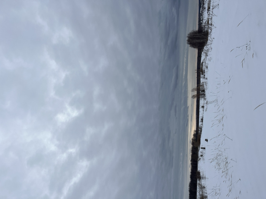 The scene depicts a snow-covered winter landscape under a heavily overcast sky, likely situated in or near Kalinino, Russia. The sky occupies approximately two-thirds of the frame, filled with dense, uniform grey altocumulus clouds, exhibiting minimal contrast and suggesting diffused light. The horizon features a dark, bare tree line extending across the entire width of the image, with a faint, lighter grey-orange band visible just above it, indicating a distant, low sun or a break in the cloud cover. The foreground and midground consist of an expansive field uniformly covered in white snow. Scattered clumps of dried, light brown grasses protrude from the snow, primarily in the lower half of the image. Several dark, truncated wooden objects, possibly tree stumps or posts, are partially visible above the snow in the midground, particularly towards the left and center. On the right midground, a cluster of bare deciduous trees with pale bark stands prominently. No individuals, animals, structures, or active interactions are visible within the frame. The environment indicates a cold, late autumn or winter day in a rural or semi-rural setting.