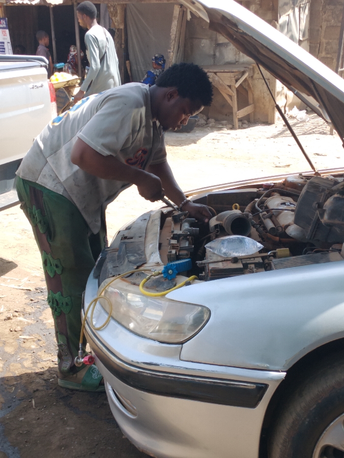 In the city of Sardauna, Nigeria, a daylight scene depicts a mechanic actively working on the engine compartment of a silver sedan with its hood open