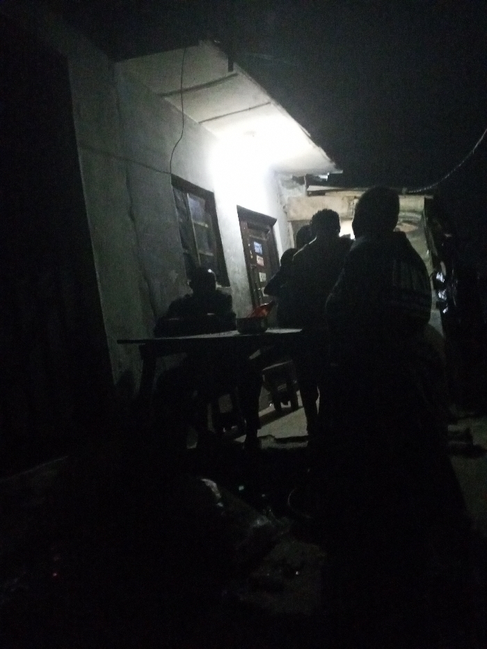 The scene depicts an outdoor or semi-outdoor gathering at night in Zango-ndaji, Nigeria