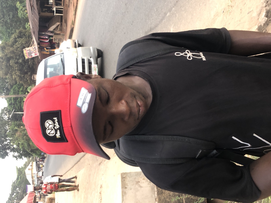 An outdoor, eye-level photograph captures a young adult male in the foreground, facing slightly left and looking downwards, eyes partially closed. He wears a red baseball cap with a black brim and a black patch featuring a white "NY New York" logo. White stickers are visible on the cap's brim. He wears a black short-sleeved t-shirt with a white embroidered symbol and text on the left chest, and a black backpack. The scene is set on a roadside in the city of Alor, Nigeria. An asphalt road stretches into the background. A white passenger van, partially obscured, is visible on the road, traveling away from the camera. Behind it, a second lighter-colored vehicle is partially visible. On the left side of the road, two adult males are walking; one is wearing a patterned red and white shirt. Buildings, including a light-colored structure with a red awning or roof-like feature, line the left side of the road. Further down on the right, rustic single-story shops or stalls with corrugated metal roofs and displayed goods are visible, one with a colorful banner. Dense green foliage and trees form the distant background. The lighting is consistent with late afternoon or early morning. The ground in the immediate foreground is an unpaved dirt area with sparse vegetation.