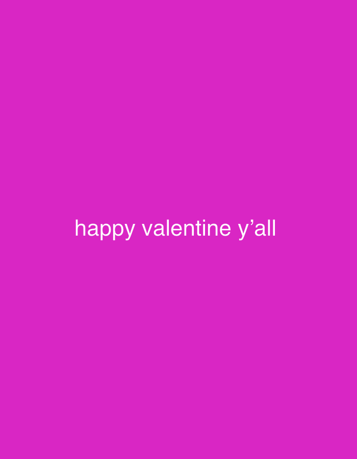 The image displays a solid magenta background, uniformly colored. Centrally positioned horizontally in the lower-middle portion of the frame is white, sans-serif text. The text reads "happy valentine y'all" in all lowercase letters. No individuals, additional subjects, or objects are present. No actions or interactions are depicted. The environment is a two-dimensional graphic; there is no discernible physical location within the city of Unknown, Unknown, or any other geographical area.