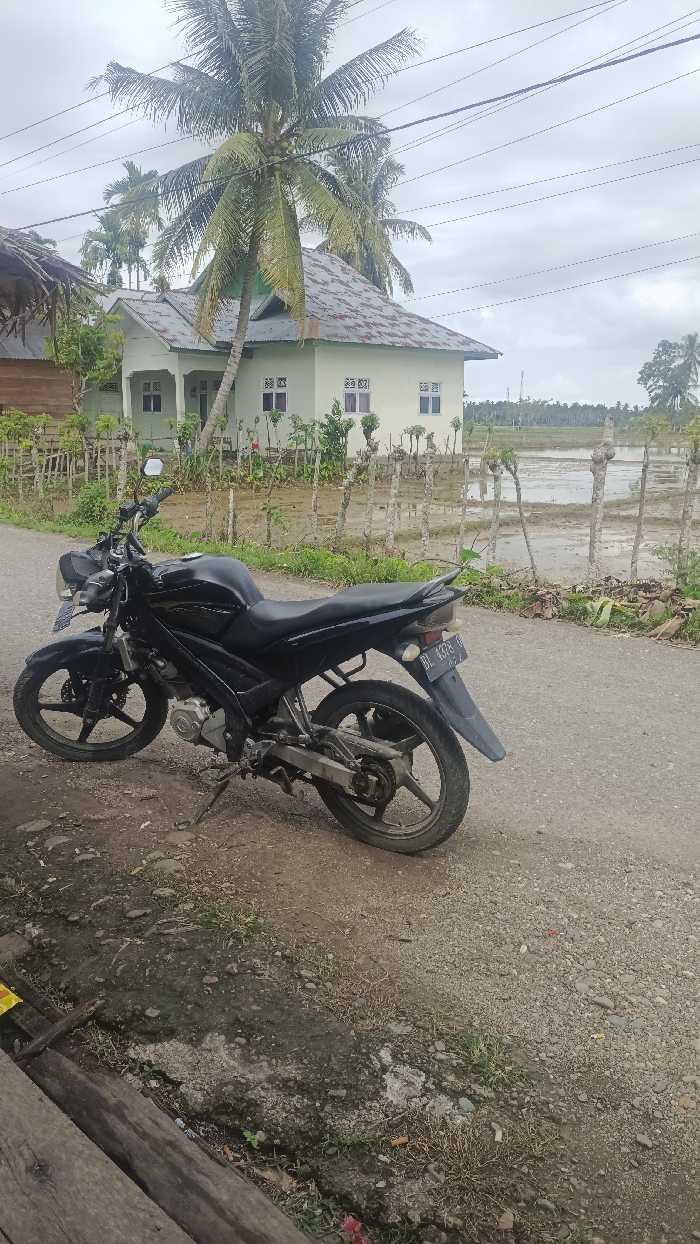 A black motorcycle is parked on a gravel road. Behind the motorcycle stands a light green house with a grey roof, set against a backdrop of palm trees and an overcast sky. A flooded field is visible beyond a rudimentary fence, suggesting a rural or agricultural setting. The ground near the motorcycle shows signs of dampness and includes some discarded debris.