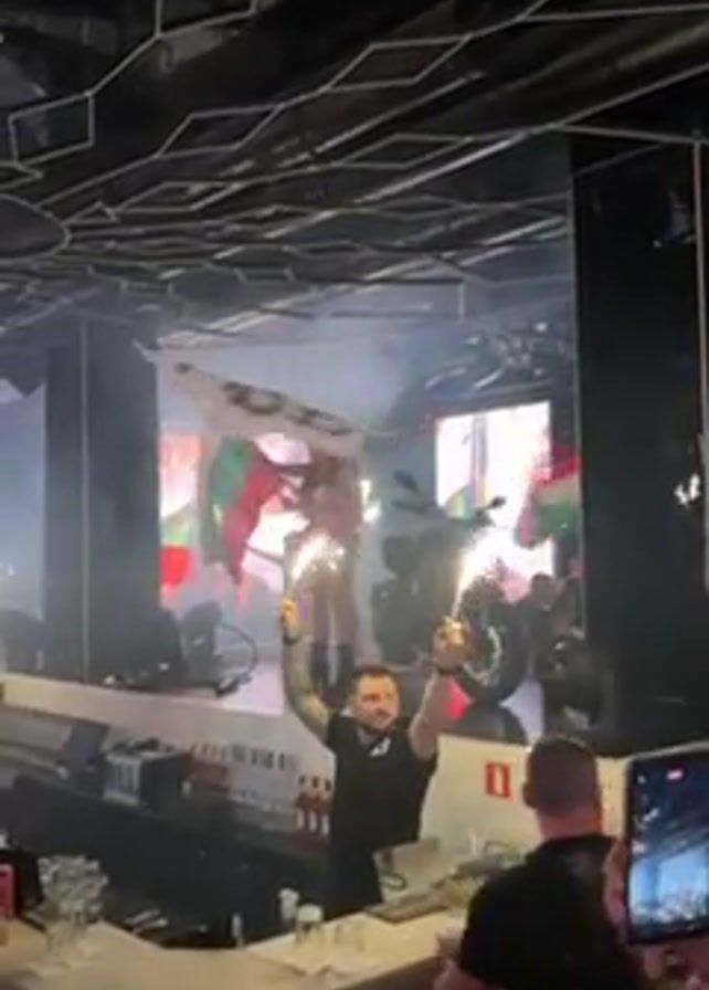 nightclub scene. A bartender is standing at the bar, holding sparklers up in the air. A woman is standing on top of the bar, waving two Bulgarian flags and another white flag with the word "Crazy" written on it. Behind the woman, there is a motorcycle on stage. Other people in the club are recording the event on their phones. The lighting is dark with bright spotlights and smoke. The ceiling has a mirrored geometric design.