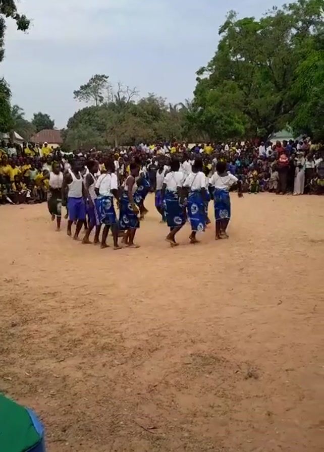 A group of about 15 people are dancing in a circle in a large dirt field. Most of the people are wearing white shirts and blue skirts with a patterned print. The people appear to be of African descent. There is a large crowd of people sitting and standing around the perimeter of the field watching the dancers. Some people are wearing yellow shirts, others are wearing white shirts, and some are wearing a variety of other colors. There are several trees around the perimeter of the field as well. The sky is overcast.