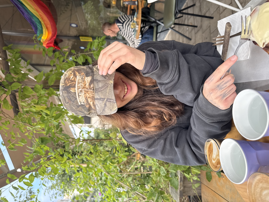 The image captures an outdoor cafe scene in Tel Aviv, Israel. A person with long brown hair, wearing a camouflage-patterned baseball cap, sits at a light-colored wooden table. The hat's front displays the text "RICE LAKE WEIGHING SYSTEMS." The person's face is partially obscured by the cap's brim and their left hand, which holds the brim; a smile is visible beneath. They are dressed in a dark grey long-sleeved top. Markings are visible on the back of their right hand, which is positioned over a white napkin, appearing to interact with or point towards a dessert. On the wooden table, four beverages are present: two light purple cups filled with clear liquid and two cups containing coffee with latte art. A dessert item, possibly a piece of cake topped with white cream, rests on a white napkin. Two forks are placed beside the dessert, one featuring a distinct wooden handle. The background shows a lively outdoor environment. Lush green foliage, likely from climbing plants, frames the scene. A translucent or light-colored awning provides overhead cover. To the right, through a glass partition, a blurred male figure wearing a striped shirt is visible seated at another table. Above this area, a rainbow-colored fabric banner is draped. The ground is paved, and additional outdoor cafe furniture, including dark chairs with green cushions, is discernible.