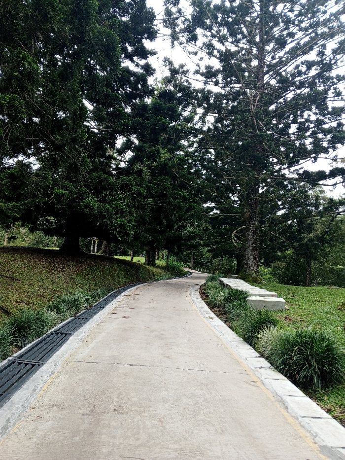 A winding concrete path extends through a lush green landscape. Large evergreen trees flank the path, casting shadows over the scene. A drainage system runs along the path's left edge. On the right, a low concrete wall is interspersed with clumps of green grass. The path curves gently, leading the eye towards the back of the image. The sky appears overcast.