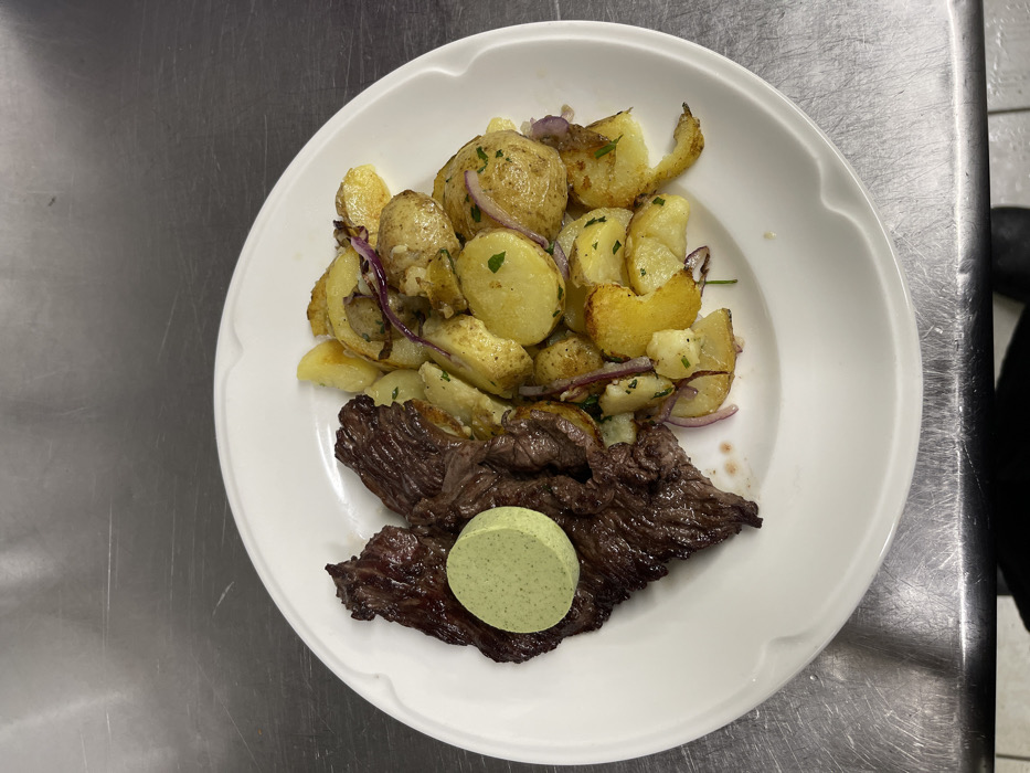 A white, round dinner plate, featuring a subtle decorative edge, is centered on a brushed stainless steel surface. The plate holds a prepared meal consisting of dark brown, seared meat, likely skirt or flank steak, arranged on the left side. A circular pat of light green, finely speckled herb butter rests on top of the meat. The right side of the plate contains a pile of golden-yellow roasted or pan-fried potato pieces, irregularly cut, mixed with thin slices of red onion and chopped green herbs. The metallic surface suggests a professional kitchen or food preparation environment. No individuals or specific actions are visible. The image itself provides no identifying information regarding the location in the city of Strasbourg, France.