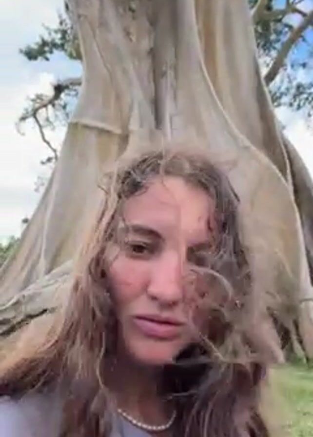 A woman with long, curly brown hair and a white shirt is looking at the camera. She is standing in front of a very large tree with a light-colored trunk and many bare branches. Behind her is a lawn and part of a building with a traditional-looking roof. She moves the camera around to show the tree from different angles.