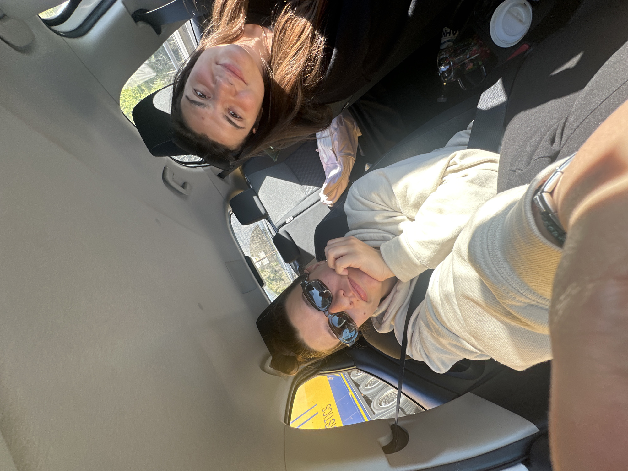 Two people are visible inside a vehicle, likely a car. One person is wearing a black top, seated in the back. The second person wears sunglasses and a light-colored hoodie. A glimpse of a commercial vehicle with the word "LOGISTICS" printed on its side is visible through the car window. The location of the photo is not indicated by anything visible in the photo. The location of Dolna Vasilitsa, Bulgaria, is not indicated by anything visible in the photo.