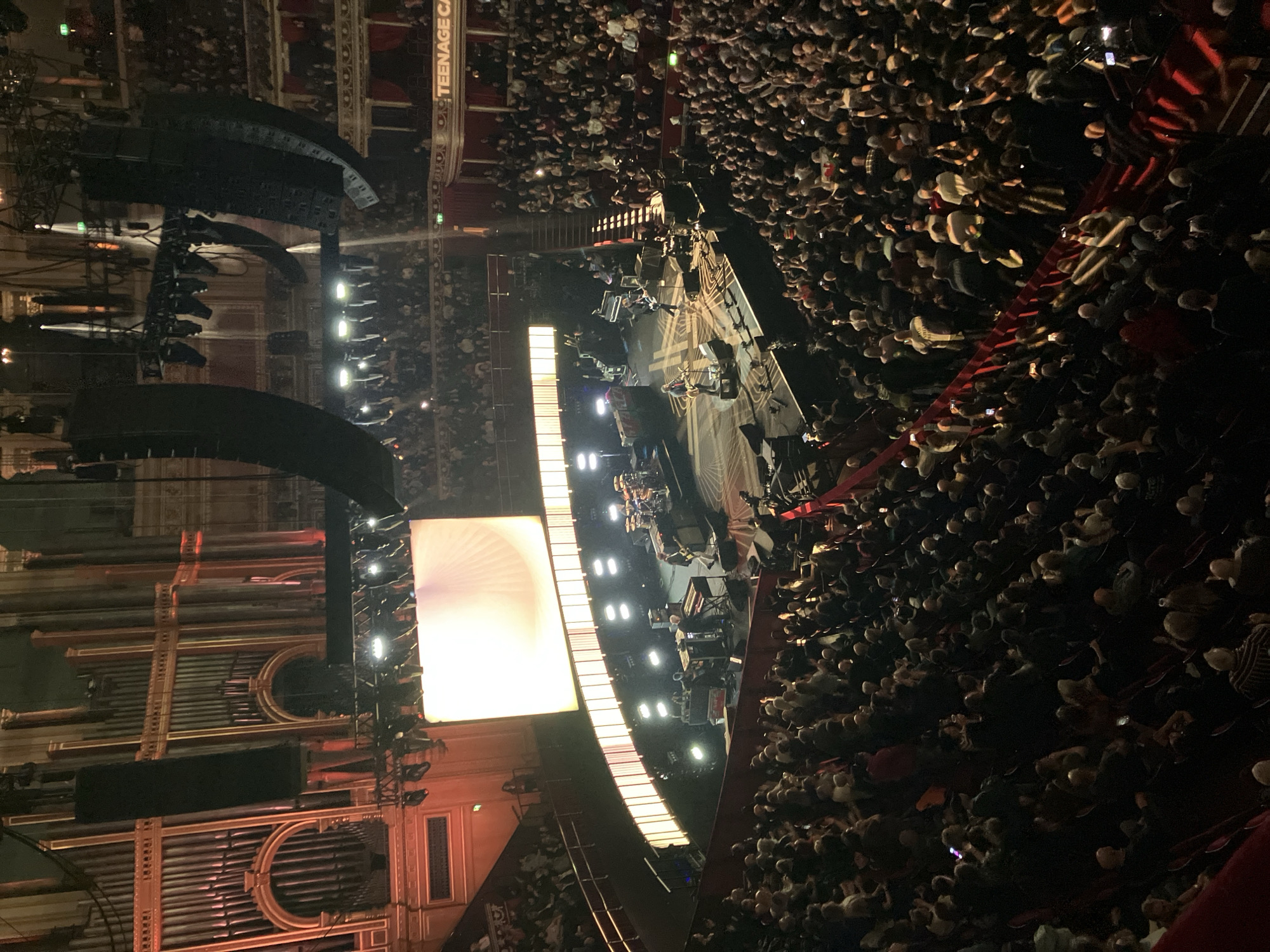 - "The image displays a live music performance inside the Royal Albert Hall, London, United Kingdom, viewed from an elevated seating section looking down towards the stage and audience" by FM-nbjkJ2, licensed under CC BY 4.0