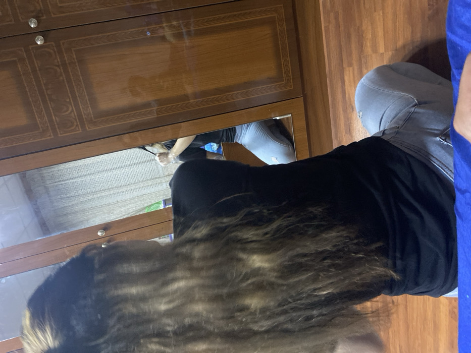 The scene is located indoors in Lom, Bulgaria. A person with long, wavy, multi-toned hair (brown and blonde highlights) kneels on a reddish-brown wooden laminate floor. The individual is oriented away from the camera, facing a large mirror integrated into a two-door wooden wardrobe. The wardrobe doors are characterized by ornate decorative patterns and two spherical, reflective handles. The person wears a black t-shirt and light blue jeans, which show a distressed area on the right knee, visible via reflection. The mirror reflects the individual's front profile. Their right hand, covered with a clear protective glove, is raised and holds a section of their hair using a dark, elongated object. This action indicates a hair care or styling activity. In the background of the reflected image, a window covered by sheer white curtains is partially visible. A segment of blue fabric occupies the immediate foreground of the original image.
