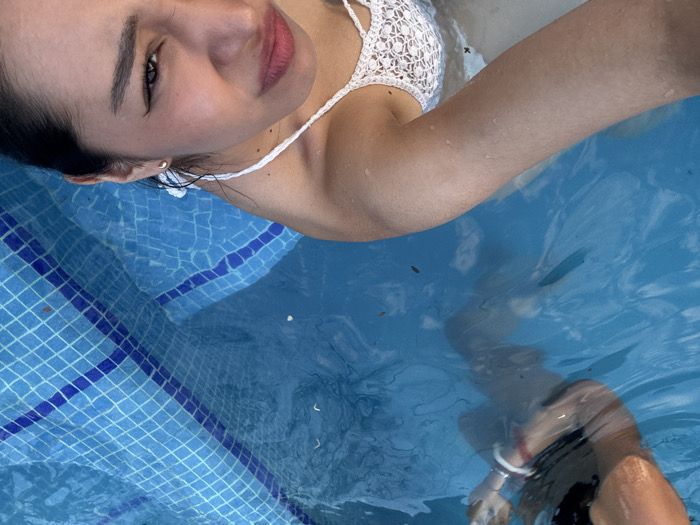 This image depicts a close-up, high-angle view of a swimming pool scene in Tenextepec, Mexico. In the foreground, a female subject is partially submerged in clear blue water, visible from her upper chest upwards. She wears a white crocheted bikini top. Her face, turned towards the camera, features dark hair, dark eyes with eyeliner, red lipstick, and a silver stud earring in her right ear. Water droplets are present on her visible skin. In the mid-ground, a second individual's lower body, including legs and a portion of the torso clad in dark swimwear, is submerged in the water. One arm of this individual is partially visible, showing a white band and a red band. The pool's interior wall on the right and bottom edge of the frame is lined with blue mosaic tiles, accented by darker blue grid lines. The water surface exhibits ripples and contains various small, dark specks of floating debris.