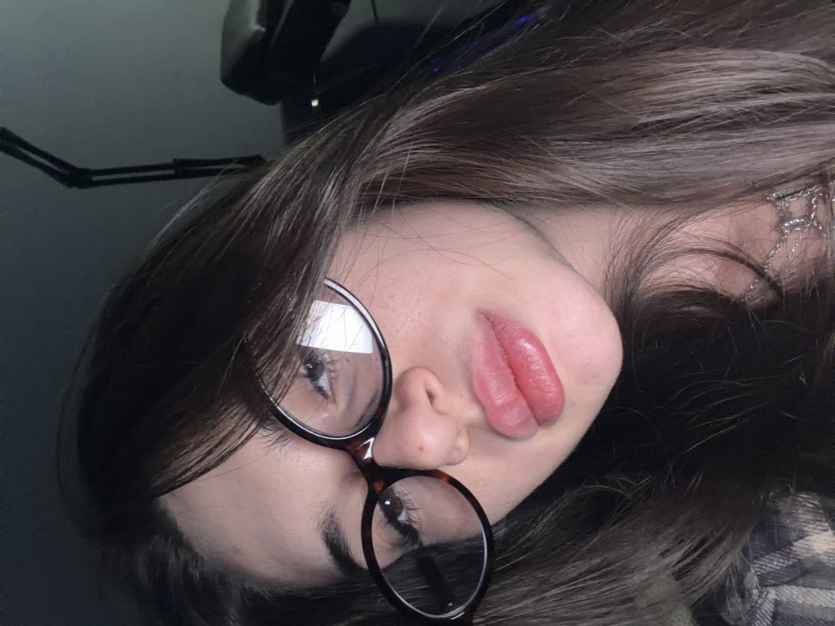 A young woman with long, dark brown hair looks directly into the camera. She wears tortoise-shell framed glasses. Her skin is fair. Her lips are slightly parted. A silver chain necklace is visible at her neck. A dark-colored shirt or jacket appears in the corner of the frame. The background is dark. A lamp is situated behind her head on the top edge of the frame. The photo appears to have been taken from a slightly angled, downward perspective.
