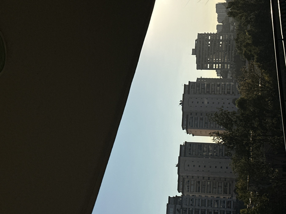 The image displays an elevated view of a modern urban landscape in Mexico City, Mexico. Approximately the upper 25% of the frame is occupied by a dark, flat architectural element, likely an overhang or ceiling. Below this, the sky is clear and light blue, transitioning to a brighter, hazy white-yellow on the far right, indicative of direct sunlight. The mid-ground features a cluster of multi-story buildings, primarily residential towers. Three prominent light-colored structures, characterized by numerous balconies and windows, and rounded upper corners, are visible towards the center-left. At least two of these buildings possess multiple satellite dishes or antennas on their rooftops. To the right of these, a fourth, darker multi-story building with a rectilinear window pattern is present, with several windows brightly reflecting light. Additional distant high-rise buildings are visible on the horizon towards the right. A significant band of dense green foliage, comprising numerous trees and shrubs, occupies the lower mid-ground, obscuring the lower portions of the buildings. A thin, dark horizontal railing is visible along the very bottom edge of the frame. The scene suggests a residential or mixed-use area within the city, consistent with districts featuring modern high-rise developments and substantial green spaces. No human figures or discernible actions are present.