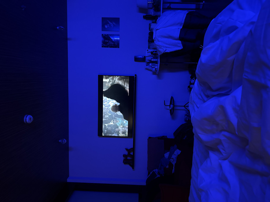 A bedroom is lit with a strong blue light. On the left, a dark brown door has a round, white smoke detector. On the right wall is a TV, below which are some figures. Above the TV, two small pictures hang. A messy shelf and some clothes are visible. To the right, a rumpled white comforter lies atop a bed, filling most of the right side of the frame.