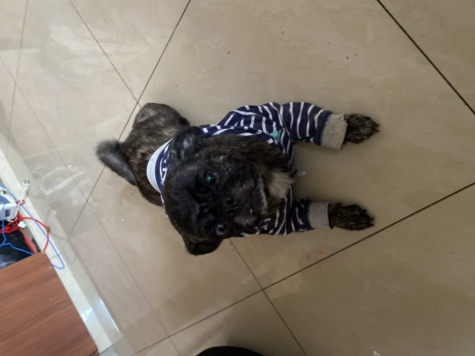 The scene is set indoors in a domestic environment within Guayaquil, Ecuador. The primary subject is a small, brachycephalic dog, appearing to be a brindle-furred pug or pug mix. The dog is lying prone on a light-colored, possibly beige or cream, tiled floor with dark grout lines. It wears a navy blue and white horizontally striped long-sleeved shirt featuring grey cuffs and an apparent grey collar, with a light blue triangular emblem on the left chest area. The dog's head is raised, and its dark eyes are directed towards the camera. Its snout is short, and a slight underbite is discernible with small teeth visible. The dog's tail is curled over its back. In the upper left background, a segment of a dark brown wooden door or furniture piece is visible. Above this, a white wall section displays red, blue, and white electrical wires connected to a white box-like device and an electrical outlet. No human subjects are present.