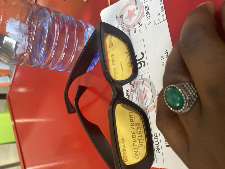 A boarding pass for MaxAir flight VM1639 from Bauchi to Abuja for passenger ONIFADE/DAMI, seat 9C, dated February 3rd. The boarding pass is partially covered by black-framed sunglasses with yellow lenses. Next to the boarding pass is a person's hand wearing a large silver ring with a green stone. A plastic water bottle lies on a red surface, completing the scene.