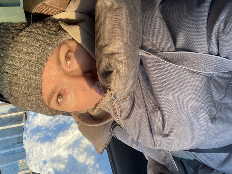 An individual is captured in a close-up, eye-level indoor-outdoor portrait, likely within a vehicle, in Прикамский, Russia. The person, appearing female, occupies the majority of the frame, facing forward with direct eye contact towards the viewer. They wear a grey knit beanie adorned with small reflective elements, and a light brown hooded garment under a grey, textured, padded winter jacket with a visible silver zipper and a drawstring near the collar. The jacket collar is drawn up, partially obscuring the lower face, chin, and neck. Strong direct sunlight illuminates the forehead, upper cheeks, and brown eyes, creating a sharp shadow that covers the lower portion of the face. In the background, visible through a window, a bright, sunlit outdoor winter scene unfolds. A large, irregular mound of white snow dominates the left side of the exterior view. Above and to the left of the snow, a wooden structure, possibly a building wall or fence, is partially visible, featuring what appears to be a window frame or aperture. A clear blue sky with wispy white clouds is present above the distant elements. The immediate left of the subject features a dark, unidentifiable interior surface, possibly a car door panel or window trim.