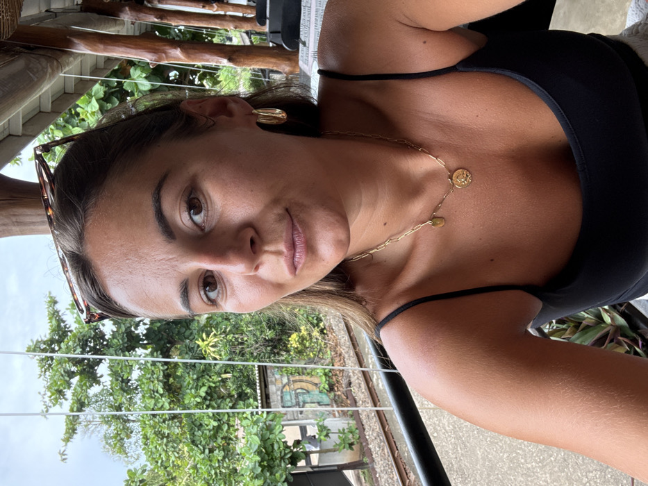 A selfie of a light-skinned woman wearing a black spaghetti-strap top. She has brown eyes, brown hair, and is wearing gold hoop earrings and a gold necklace with circular pendants. Sunglasses rest on her head. The background includes lush green foliage and a structure with wooden beams. The photo is taken at a slight angle, showcasing the woman's face and upper body.