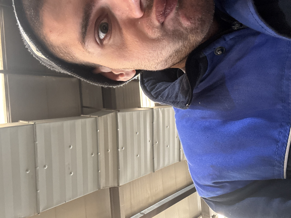 The image displays a low-angle, close-up perspective of a male individual, partially visible on the right side of the frame, positioned within an industrial interior in Chirpan, Bulgaria. The man wears a dark beanie and a blue work jacket with a dark, zippered collar. His visible right eye is wide open, and his lips are pursed. The background consists of multiple parallel, light-colored, rectangular ducts or beams, likely part of a ventilation or structural system, extending horizontally across the upper portion of the frame. These ducts exhibit horizontal corrugations and visible circular fasteners. A darker structural beam is partially visible on the far left. The scene is illuminated by an apparent overhead light source.