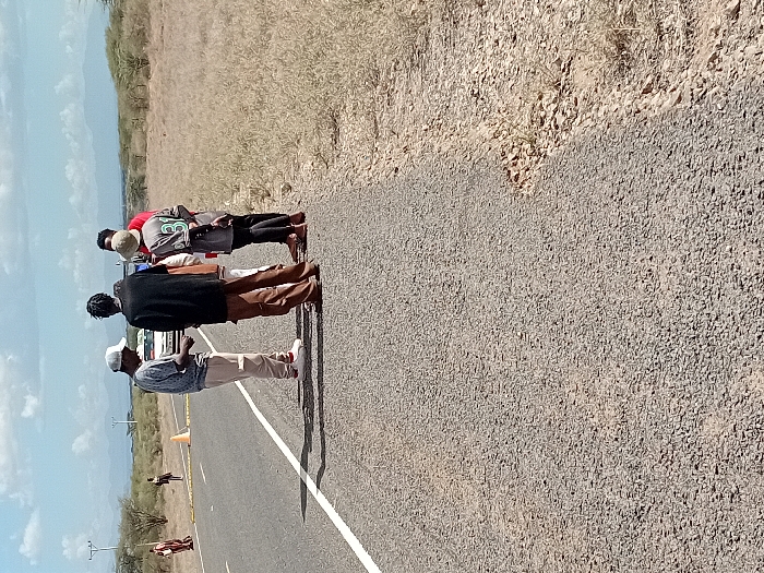 Three people stand on the asphalt road, two of whom have turned their backs to the camera. A third person stands facing the road wearing a white hat, patterned shirt, and beige pants. The road has a white dividing line. In the distance, there is a yellow traffic cone and a few people further down the road. The shoulder of the road is dry and rocky, blending into dry grass and scrub brush. The sky is blue with some clouds on the horizon.