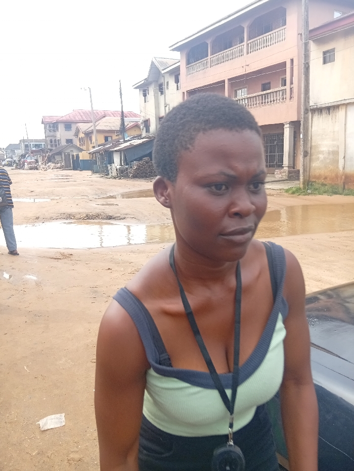 The image displays an adult female standing on an unpaved, waterlogged dirt road in Aba, Nigeria